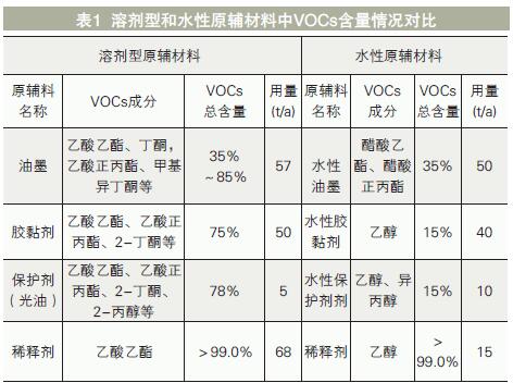 某薄膜印刷企業(yè)分別采用溶劑型和水性原輔材料生產(chǎn)同一產(chǎn)品的情況下,VOCs的成分及含量對比情況見表1。該企業(yè)改用水性材料后,VOCs產(chǎn)生量減少了約80%。可見采用水性原輔材料可大大減少VOCs排放種類和數(shù)量。