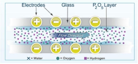 基本原理:傳感器采用五氧化二磷電解法原理,此傳感器由一個玻璃材質的圓柱和兩根并行的電極(通常由鉑或銠金屬絲制成)組成,并在兩根電極之間涂有很薄的一層磷酸膜層。在兩電極間施加一直流電壓,氣體中的水分被作為吸濕劑的五氧化二磷膜層連續吸收,生成磷酸,并被電解為氫和氧,同時五氧化二磷得以再生。通過連續的電解過程,在樣氣的水分含量與電解后的水分之間建立平衡,電解電流與樣氣中水分含量成比例。